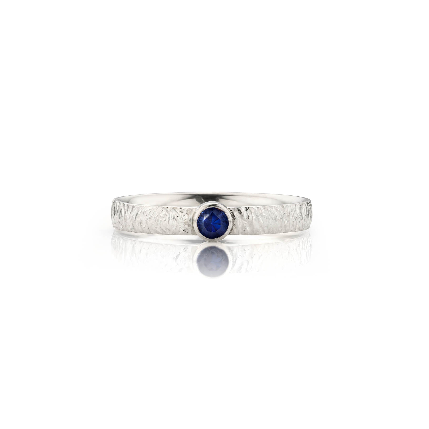 De ring is met vakmanschap vervaardigd uit sterling zilver en heeft een subtiel gestructureerd oppervlak dat doet denken aan de rimpeling van het water, wat zorgt voor een eigentijdse en toch verfijnde uitstraling. De zorgvuldig geselecteerde Saffier is diepblauw en vangt op subtiele wijze het licht, waardoor de steen nog meer diepte en karakter krijgt. Perfect voor dagelijks gebruik of als betekenisvol cadeau.