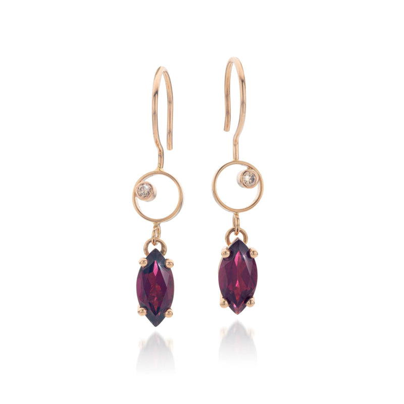 Deze oorbellen zijn niet alleen een elegant staaltje vakmanschap, maar ook volledig uniek. Vervaardigd uit 14 karaat roodgoud en bezet met een rijke rhodoliet granaat en sprankelende bruine diamant, zijn deze oorbellen one of a kind. Ze zijn speciaal ontworpen en zullen niet opnieuw worden gemaakt, waardoor je verzekerd bent van een exclusief sieraad dat nergens anders te vinden is.